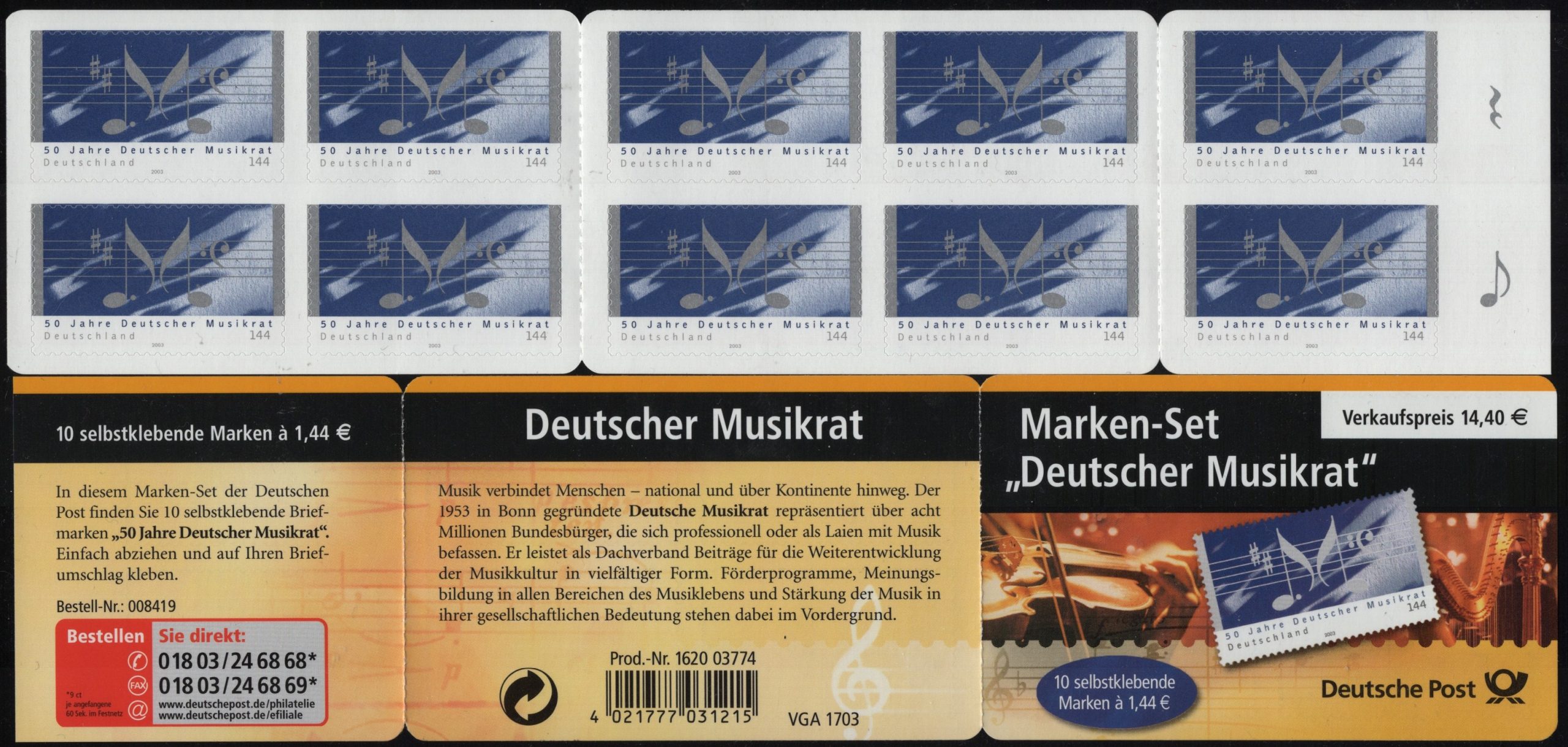 Bund – Markenheftchen – ab Euroeinführung – postfrisch – MH 054 b II – Michel: 2380 – 50 Jahre Musikrat 2004 mit 25 Kerben